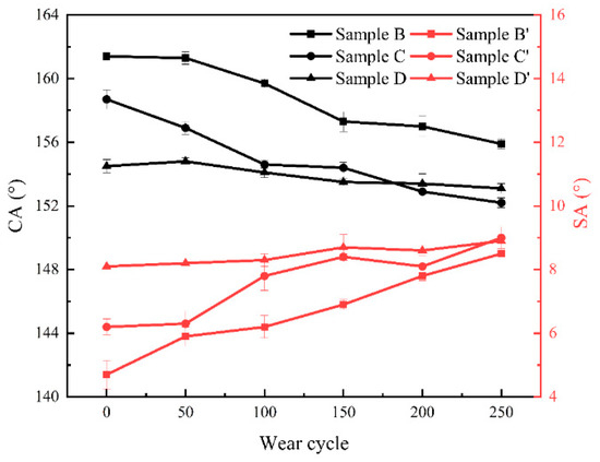 Samples B’, C’, and D’ in the figure were obtained from samples B, C, and D in Table 1 after 250 times of wear. As shown in Figure 10, samples B, C, and D were worn 250 times with contact angles above 150° and rolling angles within 10°, with little change compared to the initial state and remaining superhydrophobic. After 250 cycles of wear testing, the water contact angle and rolling angle were quite similar for the three coated samples.