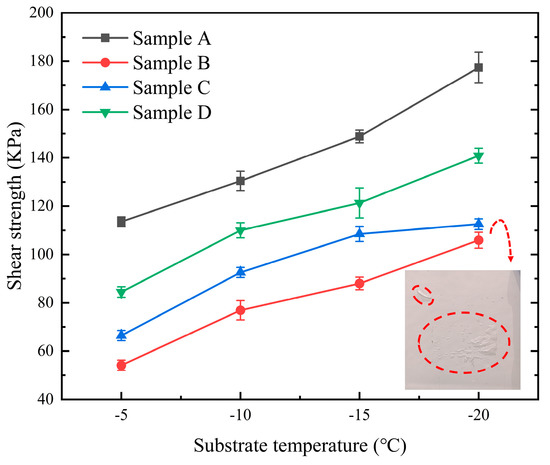 As shown in Figure 11, the ice adhesion strengths of ice-covered samples A, B, C, and D at −5 °C were 113.56 kPa, 54.14 kPa, 66.44 kPa, and 84.44 kPa, respectively; at −20 °C, the ice adhesion strengths were 177.36 kPa, 105.92 kPa, 112.56 kPa, and 140.88 kPa. The ice adhesion strength of the superhydrophobic coating was smaller than that of the epoxy resin board. One reason for the smaller strength was because, during the icing process, the micro–nano rough structure voids of the coating were filled by air, the surface maintained the Cassie state, and the actual contact area between the coating and the ice layer was smaller [49]. Another reason was that there were many hydroxyl groups on the surface of the epoxy resin board; thus, many hydrogen bonds were formed between the epoxy resin and the ice crystals during the icing process, so the icing adhesion force on the surface of the resin was larger.