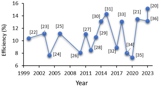 Graph showing the evolution of simulated outdoor conversion efficiency in DSSCs as a function of years [20,21,22,23,24,25,26,27,28,29,30,31,32,33,34,35,36].