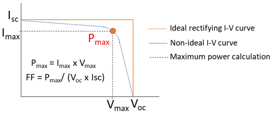 where Pmax is the maximum obtainable power, Pin is the incident light intensity, Jsc is the photocurrent for zero potential, Voc is the photovoltage measured at open circuit, and FF is the fill factor. The fill factor ranges from 0 to 1. It reflects the parasitic electrochemical and electrical losses in the cell and is easily noticeable as a deviation from an ideal rectifying I–V behavior (Figure 3).