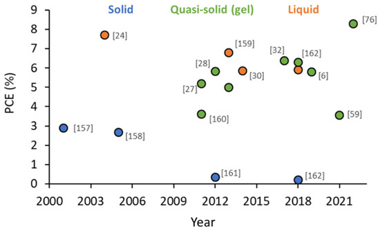 Quasi-solid-state (semisolid-state) electrolytes (QSSEs) are presented as an alternative between solid and liquid states with synergetic properties from the two phases, i.e., the cohesive property of solid and the diffusive property of liquid with ionic conductivities reaching ~10−3 S cm−1 [95,96,97]. Although the efficiencies of the DSSCs with QSSEs are often lower than those of the DSSCs with liquid electrolytes (Table 1), they continue to be very promising, owing to their improved stability and better sealing ability.