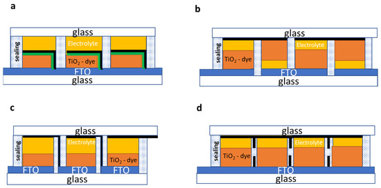 A simplified version of the DSSC has been proposed to minimize the redox mediator diffusion path and simplify cell processing by coating both electrodes on the same substrate, leading to a monolithic structure as illustrated in configuration D in Figure 4. The counter electrode material is deposited on the previously dye-sensitized TiO2 covered by a porous separator layer to prevent short circuit, and afterward, the whole structure is flooded with the liquid electrolyte. However, monolithic DSSCs do not equalize the liquid devices performance [34,80,81] due to the higher charge transfer resistance at the spacer layer/counter electrode interface, spacer layer opacity and poor counter electrode reflectivity.
