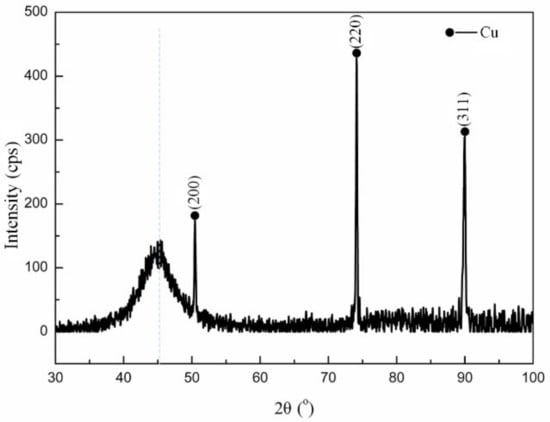 Figure 1 depicts the XRD patterns of the FeCoNiCr alloy coating. For the as-deposited layers, Cu (with a cubic structure Fm-3m) diffraction peaks present due to the deposition substrate were identified as indicated by peaks at 2θ = 50.447°, 74.123°, 89.933°. The FeCoNiCr alloy coating shows a broad diffraction peak near 2θ = 45°. This result suggests that the as-deposited alloys were amorphous.
