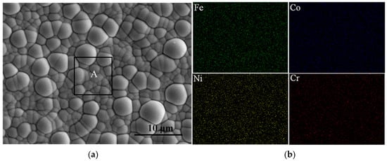 The molar entropies of mixing and thickness of the FeCoNiCr HEA coating deposited at 25 A·dm−2 are also shown in Table 2. The Fe, Co, Ni, and Cr atomic percentages in the FeCoNiCr alloy were 23.84, 28.41, 24.69, and 23.06 at.%, respectively.