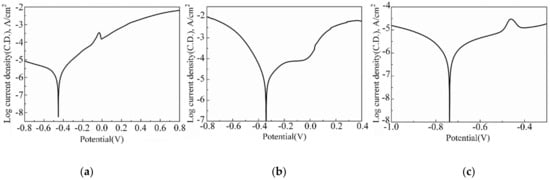 The Polarization curve of the FeCoNiCr HEA coating in (a) 3.5 wt. % NaCl solution, (b) 1 mol·L−1 H2SO4, (c) 1 mol·L−1 NaOH.