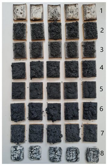 For this work, specimens of Norway spruce (Picea abies (L.) H. Karst) with dimensions of 50 mm × 40 mm × 10 mm (length × width × thickness) and moisture content of approximately 12% were used. Specimens were partitioned into 8 sets; each set contained 5 pieces. The 1st set was an unmodified sample of sound spruce wood; the 2nd set (WG) was treated with a concentrate aqueous solution of water glass (sodium silicate). Sets 3 to 8 were firstly treated with concentrate aqueous solutions of WG, and then covered by the corresponding designation of EG flakes (Table 1), and finally, they were sprayed with a 50% aqueous solution of WG. The wood specimens were covered on the top with concentrated WG using a brush, and the surface was then sprinkled with EG flakes and subsequently sprayed with a 50% WG. All three components, WG, EG, and 50% WG, were weighed before application, and the ratio of WG/EG/50% WG was 1:1:2. The quantity of all used layers of retardants was 250 g·m−2. The modified specimens were then dried to a constant weight at ambient temperature.