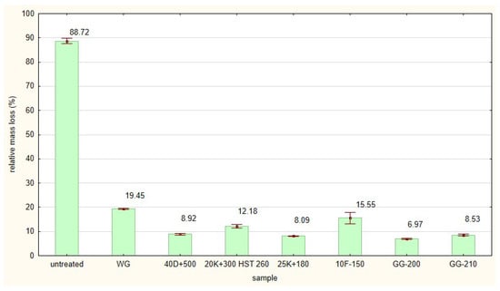 From the measurements, we calculated the relative mass loss and the relative burning rate for all seven types of treatment and for untreated spruce wood samples. Untreated wood samples achieved a significant difference in terms of relative mass loss compared to treated samples, which lost up to 88.72 ± 1.10% of their original weight, which is the highest relative mass loss among the tested samples. The treatment of samples with only WG, without the addition of EG, reduced the relative mass loss by 69.27 ± 1.32% compared to the untreated samples. The treatment of the samples with WG together with EG further improved the results from the point of view of the mentioned evaluation criterion. The relative mass loss of samples treated with a combination of EG and WG was in the range of 6.97–15.55 ± 2.63%. Similar values were achieved by the samples GG-210, 25 K + 180, and 40 D + 500, even though they were treated with EG with a significantly different fraction—90, 180, and 500. If we compare the samples based on their relative mass loss, we recorded the best results in the case of the GG-200 samples; worse results were obtained by samples 25 K + 180, GG-210, and 40 D + 500 LST, followed by samples of 20 K + 300 HST 260. Of the samples treated with a combination of EG and WG, the worst in terms of relative mass loss was 10 F-150. They were followed by samples treated only with water glass. Overall, the samples of untreated spruce wood performed worst. A certain percentage of the weight loss of the treated samples was probably also caused by the decomposition of some components of the flame retardant.
