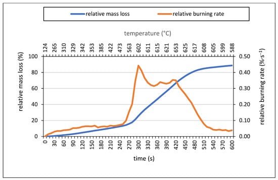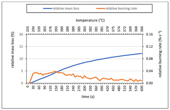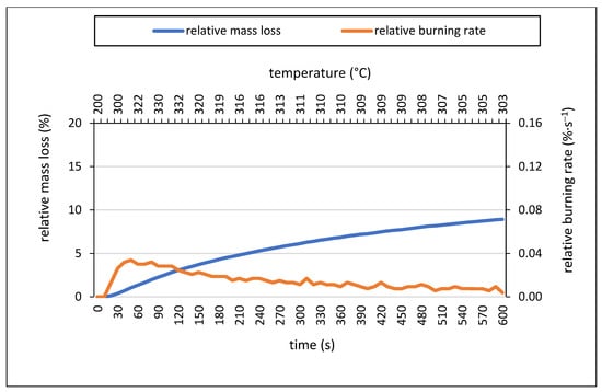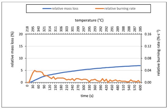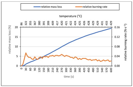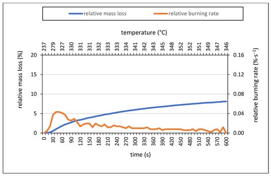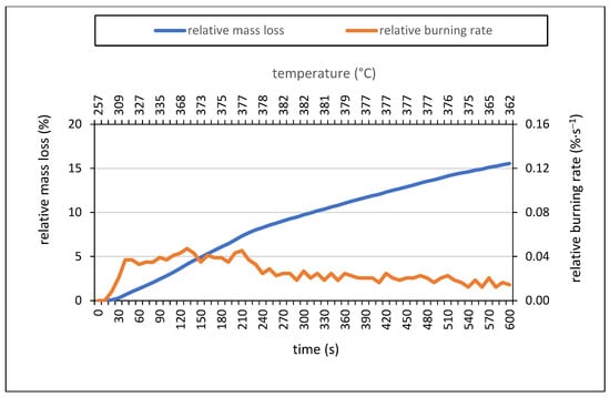 We used the non-standard test method—the radiant heat source test. The test conditions were the same as those used by Kmeťová et al. []. The total time of the experiment was 600 s; then, we calculated the relative mass loss and relative burning rate from the obtained data.