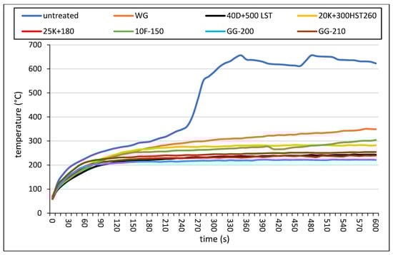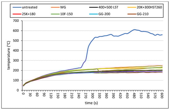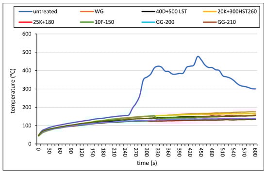 The temperature tendency on point C (in the middle of the sample front side) was approximately identical for all treated samples. In the case of samples 10 F-150, there was a slight decrease in temperature again, and then an increase up to a value of 232 °C. In the samples treated with EG and WG, the temperature increased during the first 120 s of the test, and subsequently, the temperature was almost constant; the highest temperature was reached at the end of the test (in the 600th s) in the range of 188–232 °C. Of the treated samples, the WG samples reached the highest temperature, namely 246 °C at the end of the test. As for the original samples, a sharper rise in temperature started to occur at the 250th s. The maximum temperature of 606 °C was reached in these samples in the 490th s.
