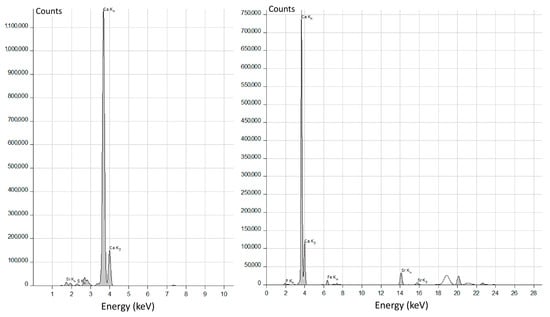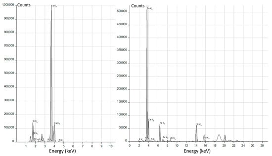 The fluorescence spectrum of elements from Na to Cl was obtained using helium purging of the system to increase the detector resolution. In the case of elements with higher atomic numbers, helium purging was not necessary. The spectra interpretation (qualitative analysis) was carried out depending on the peaks’ localization that matches the maximum energy of the electronic transition or by the presence of all maxima of each element’s characteristic transitions. Quantitative analysis was conducted using the ElvaX4.4 program package by the algorithm of fundamental parameters deriving from the ratios of the peak areas of each element to the total peak area of all elements.