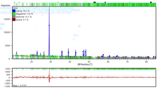 Table 8 shows that PS mainly consists of calcite (70.1 wt.%). Calcite undergoes thermal and thermochemical dissociation during firing. Calcite transformation as a result of firing is confirmed by its decrease from 70.1 wt.% (Table 8) to 25.5 wt.% (Table 9).