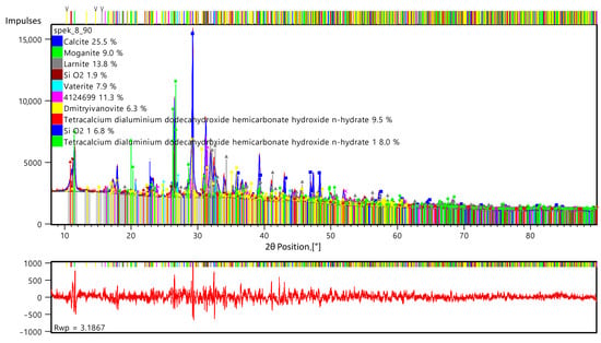 It is known that the mineralogical composition of the obtained WSA significantly depends on the technology and conditions of PS firing. Then, the mineralogical composition of PS (Figure 4, Table 8) and WSA (Figure 5, Table 9) was determined using XRD analysis.