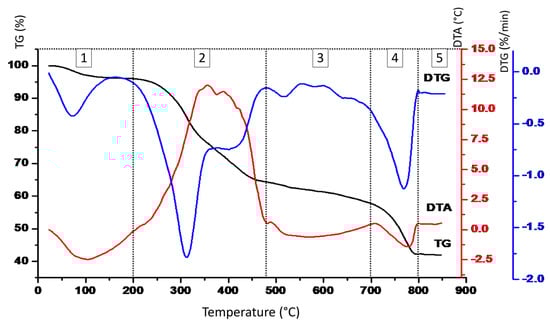 The derivative diagram illustrates the dynamics and phase transformations of PS combustion. At the intersection points of the DTA curve with its “zero” line, five characteristic zones are distinguished (Figure 6):