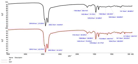 The FTIR (Fourier-transform infrared spectroscopy, PerkinElmer, Llantrisant, UK) spectra samples were recorded on a Spectrum Two spectrometer using diamond U-ATR (The Universal Attenuated Total Reflectance Accessory, PerkinElmer, Llantrisant, UK) single-reflection accessory. The spectra (16 scans per spectrum) of the samples were collected in the mid-infrared wavenumber range of 4000 to 400 cm−1, with a spectral resolution of 4 cm−1.