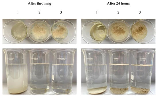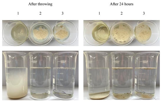 The tests were carried out in accordance with the Ukrainian standard []. The essence of the method is to determine the ability of AMP to not be wetted by water at room temperature. To do this, 500 mL of distilled water was poured into a chemical glass beaker. A weighted sample of up to 2 g was taken from the MP sample, which was poured on the water surface onto a chemical beaker with a spatula by lightly tapping it on the edge of the beaker. The beaker with distilled water and MP was left for 24 h for further examination. The powder was considered hydrophobic if, after 24 h, the entire particle mass of the weighted sample did not settle to the bottom of the beaker and the MP was not wetted with water.