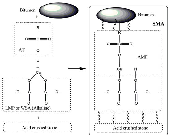 AT can be neutralized directly in MP (LMP or WSA), while a strong bond between AT and MP is formed, that is, chemical activation takes place. The presence of acids (R–O–SO2–OH; H2SO4) in AT was confirmed by FTIR spectroscopy (Table 11), and the presence of alkaline components in LMP and WSA was confirmed by XRD analysis (Table 10 and Table 9, respectively). For example, the following chemical reactions are possible between acids and calcite during AT activation: