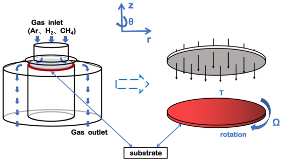 The physical diagram of the atmospheric single-substrate VRD reactor is shown in Figure 1 [15]. A round copper foil with a diameter of 220 mm is placed on a rotating base surface that is heated to between 1230 K and 1330 K and rotates at a speed set between 300 rpm (revolutions per minute, rpm) and 1500 rpm. The inlet temperature is 423 K.