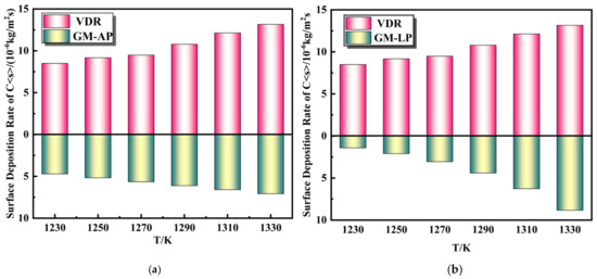 Comparison of carbon surface deposition rates between a rotating CVD reactor and a conventional reactor model at different reaction temperatures. (a) Comparison of surface deposition rate between VRD and general straight tube model under atmospheric pressure and (b) Comparison of surface deposition rate between VRD and general straight tube model under low pressure.