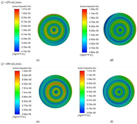 Cloud map of the influence of different intake flow rates on deposition rates. (a) T = 1290 K. (b) T = 1310 K. (c) T = 1290 K. (d) T = 1310 K. (e) T = 1290 K. (f) T = 1310 K.