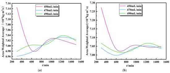 Therefore, in this section, when the temperatures of the rotating base surface were set at T = 1290 K and 1310 K, and the base speeds were 300 rpm, 600 rpm, 900 rpm, 1200 rpm, and 1500 rpm, the surface deposition rates of graphene deposited by the rotating base surface radial in the VRD reactor were set according to the total inlet air flow Q = 450 mL/min, 470 mL/min, and 490 mL/min, respectively. In order to more accurately reflect the surface deposition rates of graphene at different base surface rotational speeds, the simulation results were expressed in the form of a weighted average calculation. Figure 7 shows the simulation results.