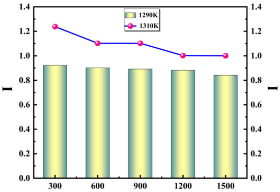 When the inlet gas flow rate V = 470 mL/min and the reaction base surface temperature was 1230 K–1330 K, the rotating base surface speeds were set as 300 rpm, 600 rpm, 900 rpm, 1200 rpm, and 1500 rpm. The simulation results are shown in Figure 10.