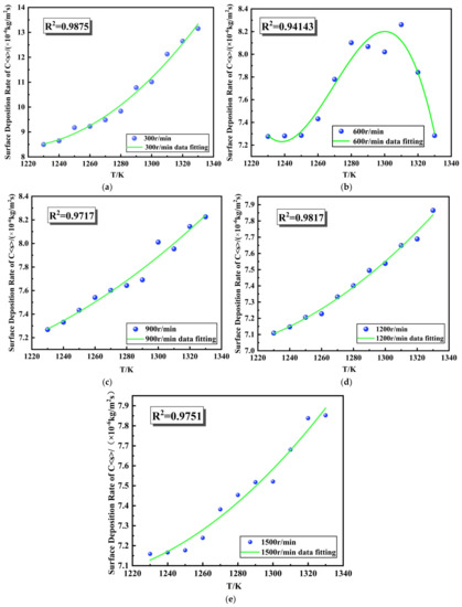 Figure 5a–f show the surface deposition rate nephogram of carbon at different reaction temperatures. It can be clearly seen from Figure 5 that the carbon surface deposition rate on the VRD reactor base surface generally increased with the increase in temperature. It can be seen from Figure 5 that the variation in the carbon deposition rate with temperature was consistent with the following equation, between 1230 K and 1330 K: