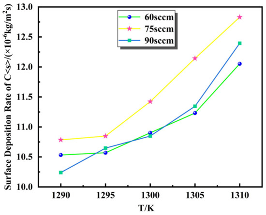 When the reaction temperature was between 1290 K and 1310 K and the H2 flow rates were set as 60 sccm, 75 sccm, and 90 sccm, the graphene surface deposition rate results were obtained, as shown in Figure 12: