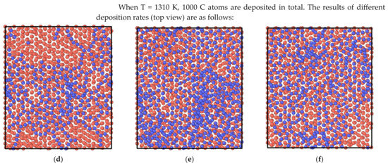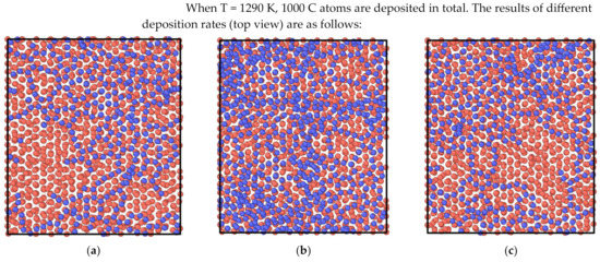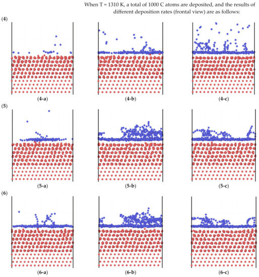 In order to improve the efficiency of the simulation calculations, pyrolysis carbon atoms were used to replace the simplified model for the gas mixture. The carbon deposition rate was used as a representation of the gas mixture flow rate, which was expressed by the number of atoms deposited by 1 ps, expressed in ps−1. The system was controlled as a canonical ensemble (NVT), the temperature of the simulation system was controlled as 1290 K and 1310 K, and the time step was set as 0.001 ps. In the LAMMPS simulation environment, based on empirical potential, the time step was set to 1 fs.