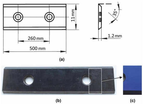 The substrates used were commercial knives (Figure 1) manufactured in Germany by the Leitz company. Sample sizes and general view of the sample are shown in Figure 1a,b.