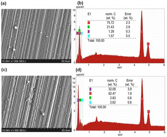 SEM images of coating surfaces (left), EDS spectrum and elemental composition table, corresponding (right): (a) TiN coating surface; (b) TiN coating surface composition; (c) DLC/TiN coating surface; (d) DLC/TiN coating surface composition.