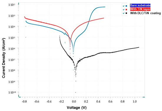 Potentiodynamic curves of the TiN and DLC/TiN coatings on the cemented tungsten carbide (WC—3 wt.% Co) in the 3% aqueous solution of NaCl at vp = 1 mV/s.