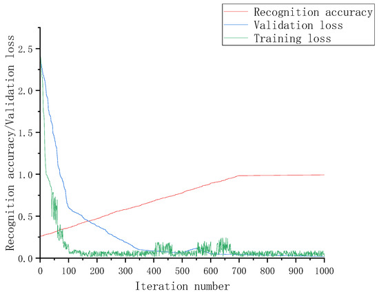 The Figure 5 illustrates the training process of the MM model network, including the curves for accuracy, training loss, and validation loss. It can be observed from the graph that with the increase in the number of iterations, the model’s accuracy on the validation set continues to rise while its loss decreases continuously. The model exhibits good convergence and achieves an accuracy of around 98.4% after 700 iterations.