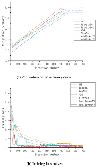 After 1000 iterations, AlexNet, ResNet-50, and VGG achieved classification accuracies of 91.30%, 89.7%, and 93.56%, respectively, while ResNet-101, MobileNetV2, and MobileNetV3 achieved slightly better accuracies of 97.38%, 94.6%, and 96.7%, respectively. Compared to Resnet50, MM increased the accuracy by 8.36 percentage points, by 0.38 percentage points compared to ResNet-101, by 4.5 percentage points compared to VGG, by 6.76 percentage points compared to AlexNet, by 3.46 percentage points compared to MobileNetV2, and by 1.36 percentage points compared to MobileNetV3. Additionally, MM had a faster decrease in training loss compared to the other models, with a final loss value approaching zero as shown in Figure 6. Moreover, MM had smaller feature memory and fewer floating-point computations, while its recall and F1 metrics were relatively higher. These results fully demonstrate that the key-point feature convolutional operation reduces the number of network parameters and that the key-point feature set mapping fusion operation promotes information exchange between key points, making it effective in reducing performance losses.