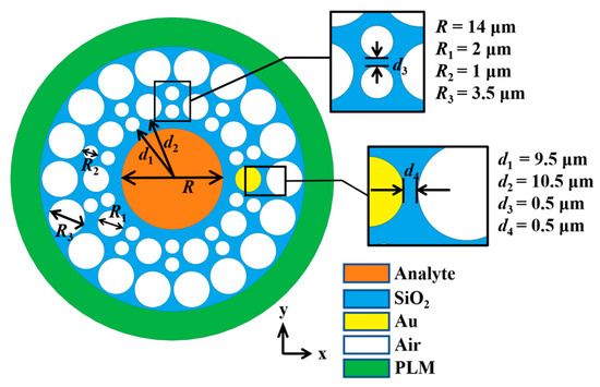 Optical fiber sensing technology is regarded as one of the key components of intelligent detection fields which has been pushing great progresses in the new scientific and technological revolution [1]. In recent years, highly sensitive sensors with an extra-wide detection range are urgently needed in order to accurately measure concentrations of biomedical analytes, harmful chemicals, and environmental pollutants [2,3]. Among the reported sensors, photonic crystal fiber sensors based on surface plasmon resonance (PCF-SPR) for refractive index (RI) detection have undoubtedly gained great attention due to their advantages of small size, extremely high sensitivity, and remote monitoring. PCF-SPR sensors are integrated with the superiorities of both the PCF and SPR sensing techniques [4,5]. On the one hand, surface plasmon resonance (SPR) is a physical optical phenomenon that occurs at the metal/dielectric interface, which is extremely sensitive to the RI of the surrounding medium [6,7,8,9]. On the other hand, PCF is a new type of microstructured optical fiber with periodically arranged air holes introduced into the cladding, which has been widely used in fiber optic communication, fluorescence enhancement, and other fields due to the flexibility of the structural design. In addition, the combination of PCF and SPR technology can effectively improve the RI range and sensitivity of sensors, and PCF–SPR has become one of the hot topics in the optical field [10,11,12,13].