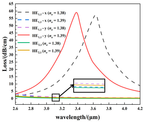 Using this set of parameters, the structure may stably support multiple modes, but different modes have different effects when exciting the SPR. In fact, the ring-core PCF-SPR is composed of a metal waveguide on the right and a PCF waveguide on the left. The SPP modes in the metal waveguide on the right can sense changes in the RI of the analyte. The PCF waveguide on the left has the fundamental mode HE1,1 and higher-order mode HE2,1, with different modes corresponding to two polarization states, namely x−polarization and y−polarization. Figure 2 shows the coupling effect of different modes with plasmonic modes for an RI of 1.38. The loss can be calculated from Equation (3) [33]: