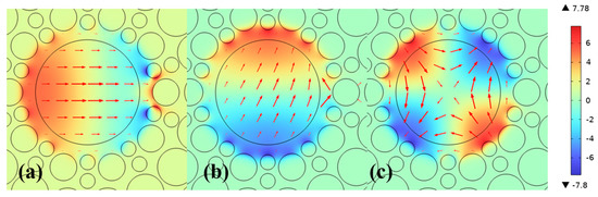 HE1,1 mode electric field distributions: (a) x−polarization and (b) y−polarization; (c) HE2,1 mode electric field distributions.
