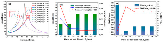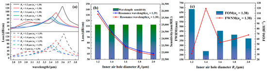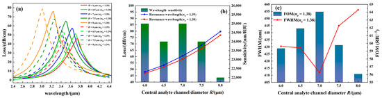 (a) Loss curves; (b) wavelength sensitivity, and (c) relationship between FOM and FWHM: na = 1.38, 1.39, corresponding to a central analyte channel diameter of 6 μm ≤ R ≤ 8 μm.
