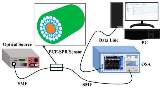 PCF structures can be fabricated using the sol–gel method, which utilizes the catalyst to hydrolyze the materials, and shrinkage leads to the sol formation [34]. SiO2 powder is processed into optical fiber preform using gel heat treatment; the optical fiber preform is melted at a high temperature in the drawing tower and is drawn to form an optical fiber [35,36]. Afterwards, the metal fills the air hole by chemical deposition, and the PCF-SPR sensor is completed after coating. The schematic diagram of the sensor to detect RI (s) is depicted in Figure 7. SMF is welded on both sides of the sensor, and the light source and OSA are connected separately. The data measured by the OSA are transmitted to a PC to generate the loss spectra.