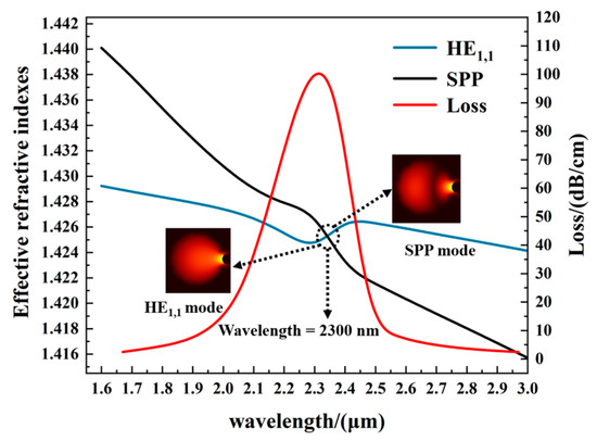 After optimizing the structure, excellent sensing characteristics are obtained. Here, we focus on the coupling characteristics, sensitivity, FOM, and other important indicators of the PCF sensor. In general, the resonance conditions of the HE1,1 mode and plasmonic mode require the propagation constants to be equal. That is, the dispersion curves of the HE1,1 mode and plasmonic mode should intersect. When the RI of the analyte is 1.43, the dispersion relation diagrams of the HE1,1 mode and the plasmonic mode are as shown in Figure 8. The effective RI of the fundamental mode moves gradually closer to that of the plasmonic mode until it is reversed. At 2300 nm, the dispersion curve of the fundamental mode intersects that of the plasmonic mode. At this point, the loss spectrum of the fundamental mode shows a peak, indicating that most of the fundamental mode energy is transferred to the plasmonic mode, and the energy coupling is strongest at that point, thereby meeting the phase matching condition. Thus, the SPR is excited, and this wavelength at that point is the resonant wavelength.