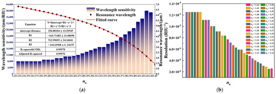 where Δλpeak is the resonance wavelength shift and Δna represents the change in the analyte RI. The wavelength sensitivity of the sensor is shown in Figure 11a. The wavelength sensitivity increases with increasing analyte RIs. When the RI is 1.43, the maximum wavelength sensitivity is 40,000 nm/RIU, and the average wavelength sensitivity of the entire detection range is 17,000 nm/RIU. Figure 11a discloses the resonance wavelength variations. As the RI increases, the resonance wavelength blue-shifts. When the RI is in the range of 1.13–1.45, the response curve of the sensor exhibits nonlinear changes. The relationship between the RI and resonant wavelength of the analyte obtained by polynomial fitting is shown in Equation (5):