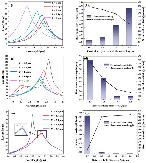 In manufacturing, there is normally a deviation between the actual preparation and theoretical simulated values. The structural sensitivity reflects the impact of the structural parameter changes on the sensing performance, which is described by the ratio of the wavelength to parameter changes. A smaller structural sensitivity increases the stability and the tolerance of production errors. Consequently, when designing PCF-SPR sensors, the impact of structural parameters should be minimized. Figure 12a–d describe the structural sensitivity of R, R1, and R3 for an RI of na = 1.38. Figure 12a,b show that as R3 increases, the resonance wavelength blue-shifts. A larger R3 reduces the distance between the fundamental mode and SPP mode to boost the resonance intensity. At the same time, the structural sensitivity is proportional to the diameter of the analyte channel. For an inner layer air hole diameter R1 shown in Figure 12c,d, as R1 goes up, the resonance wavelength shifts towards shorter wavelengths. The reason for the declining resonance intensity is that the spacing between the air holes in the cladding decreases, thus hindering the energy leakage of the fundamental mode to the SPP mode. The overall structural sensitivity shows a downward trend, and in the range of 1.6 μm to 1.8 μm, the structural sensitivity stabilizes at 100 nm. Figure 12e,f show that when the diameter R3 of the outer air hole increases, the resonance wavelength red-shifts, while the loss and structure sensitivity decrease. When the diameter of the air hole is 1.9 μm, the loss curve basically coincides and the changes in the structural sensitivity decrease gradually, indicating that when the outer air hole has a certain value, the alteration of the structural parameters has less effect on the sensor performance.