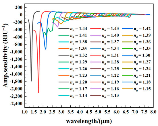 where ∂α(λ,na) is the loss at a certain wavelength when the RI of the analyte is na, α(λ,na) is the difference in the loss caused by changes in the RIs of adjacent analytes, and ∂na is the change in the RI of the analyte. Figure 13 shows the changes in the amplitude sensitivity for different RIs. When the RI goes up, the amplitude sensitivity increases first and then decreases. The curve of amplitude sensitivity is similar, showing no obvious changes in the range of 1.13–1.38. The peak appears in the range of 1.38–1.44, and the maximum amplitude sensitivity of the sensor is 2052 RIU−1.
