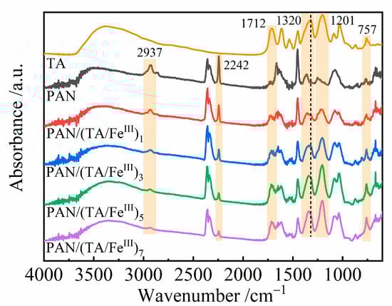 FTIR-ATR spectra of PAN, PAN/(TA/FeIII)1, PAN/(TA/FeIII)3, PAN/(TA/FeIII)5, PAN/(TA/FeIII)7 nanofibrous membranes.