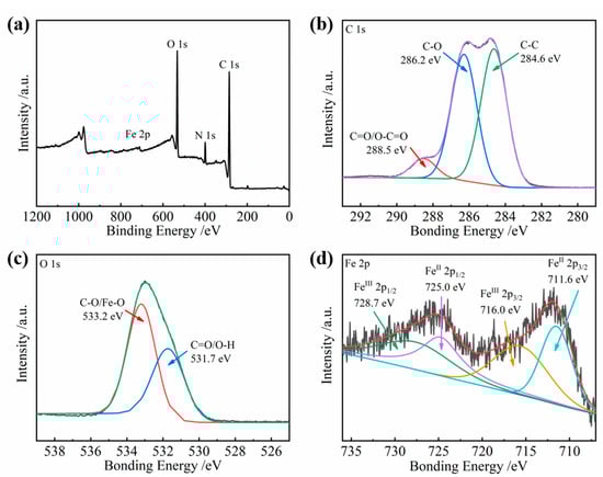 In order to further confirm the surface chemical compositions of membranes, XPS analysis is performed in Figure 2. In the full survey XPS of PAN/(TA/FeIII)5 nanofibrous membrane (Figure 2a), characteristic peaks assigned to C 1s, O 1s, N 1s, and Fe 2p can be clearly observed, indicating the existence of TA and FeIII components. The high resolution C 1s spectrum (Figure 2b) showed three dominant peaks at 284.6 eV, 286.2 eV, and 288.5 eV, assigned to C–C/C=C, C–O, and C=O/O–C=O bonds, respectively []. Deconvolution of O 1s spectrum (Figure 2c) displayed two peaks at 531.7 eV and 533.2 eV, corresponding to C–O/Fe–O, and C=O/O–H, which possibly pertained to the chelating structure of the TA/FeIII complexes [,,]. In the Fe 2p spectrum (Figure 2d), the peaks at 711.6 eV and 725.0 eV were assigned separately to Fe 2p3/2 and Fe 2p1/2 of FeII, while the peaks at 716.0 eV and 728.7 eV were attributed to Fe 2p3/2 and Fe 2p1/2 of FeIII, respectively [,]. Two valence states of Fe element showed that TA could reduce partial FeIII cations to the lower state during the self-assembly of TA/FeIII complexes [].