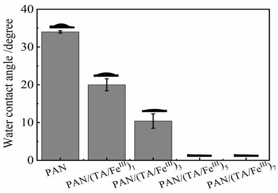 The hydrophilic properties of PAN nanofibrous membranes coated with TA/FeIII complexes are investigated in Figure 4. The water contact angle of the bare PAN nanofibrous membrane was about 35°, revealing the hydrophilicity of PAN. After being coated with TA/FeIII complexes, the modified PAN nanofibrous membranes showed smaller water contact angles. When the number of coating cycles was more than five, the water droplet dissolved immediately once contacting with the modified PAN nanofibrous membranes, illustrating that the membranes became more and more hydrophilic. The changes of water contact angles indicated that the TA/FeIII complexes can enhance the hydrophilicity of PAN membranes, which can be attributed to the hydrophilic groups of TA. On the other hand, it also confirmed that more TA/FeIII complexes adhered on the PAN nanofibrous membranes with an increase of coating cycle.