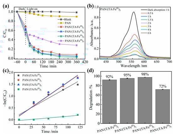 Photocatalytic degradation efficiency (a), UV-vis absorbance spectra of RhB (b), linear simulation curves of the RhB photodegradation (c), and degradation efficiency of RhB after 360 min illumination (d) over PAN/(TA/FeIII)1, PAN/(TA/FeIII)3, PAN/(TA/FeIII)5, and PAN/(TA/FeIII)7 nanofibrous membranes.