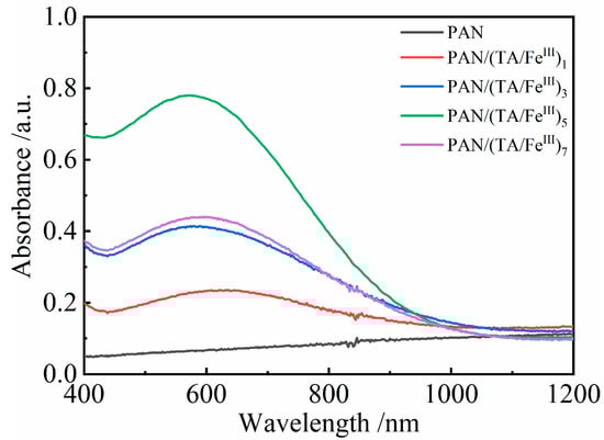 UV-vis-NIR spectra of PAN, PAN/(TA/FeIII)1, PAN/(TA/FeIII)3, PAN/(TA/FeIII)5, PAN/(TA/FeIII)7 nanofibrous membranes.