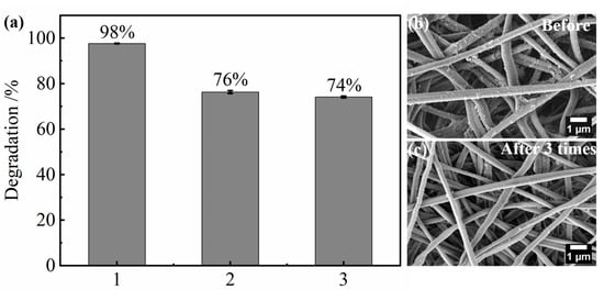 The stability of the photocatalyst was evaluated by the cycling tests shown in Figure 7a. Although the photocatalytic performance decreased slightly after each photocatalytic cycle, the degradation efficiency remained above 70%. To analyze the reason for the change in the photocatalytic property, the morphology of the PAN/(TA/FeIII)5 nanofibrous membrane after the cycling tests was investigated in Figure 7c. Compared to the original morphology of the membrane, there were only a few grains fixed on the surface of the membrane after the cycling tests. It revealed that the adhesive force between TA/FeIII complexes and PAN nanofibrous membrane should be further improved. Nevertheless, the above results confirmed the PAN nanofibrous membrane coated with TA/FeIII complexes displayed high photocatalytic performance and reusability.