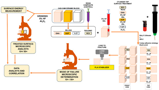 Comprehensive scheme of the experimental protocol workflow. ENA, Vita Enamic; HF, hydrofluoric acid; PLA, polylactic acid; SB-U, Scotchbond Universal adhesive; SUP, Vita Suprinity; Y-ZT, Vita zirconia.