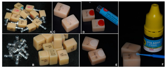 Vita Enamic blocks and surface treatment in the control group (RES). (A) before and (B) after support pin removal; (C) immediately after grinding; (D) during the hydrofluoric acid conditioning; (E) whitish conditioned and dried surface; (F) during the ceramic primer application, as recommended by the manufacturer.